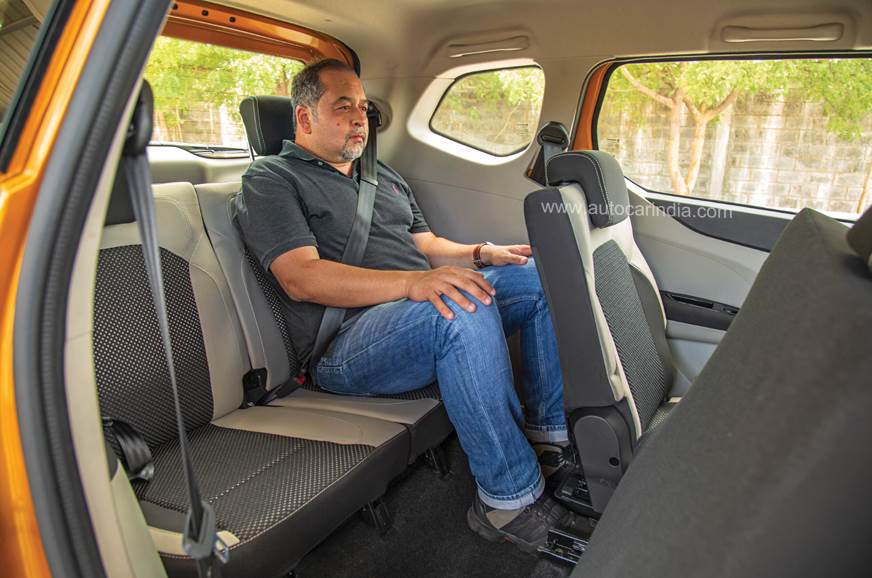 Now, clambering into the third row of a car that’s under four metres long is not expected to be easy. But here, the second row can be flipped forward with just two fingers, and the large rear door allows you to step into the third row easily. And although the seat is a bit low and you sit with your knees slightly up; the third row is actually quite useable. There is no inertia reel or self-adjusting seat belts, as Renault says there’s no place for the mechanism, and the headroom for six-footers will be tight, but, otherwise, there’s enough space in the back for even longish stints.