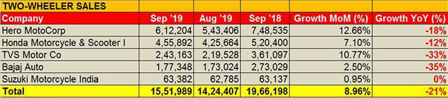 Taking the domestic sales statistics of five leading motorcycle and scooter manufacturers for September 2019 and comparing them with their August 2019 performance indicates a 9 percent month-on-month growth. The comparison points to a 21 percent decline but that story is the same for nearly all vehicle segments.