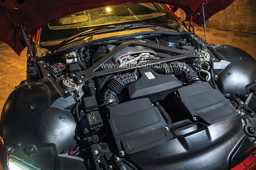 Just as I get lost in imagining my Vantage (I’d like one in Lime Essence green with black rims, thank you very much), Ashley pops open the hood. The engine is pushed all the way back against the firewall and the arrangement in part helps the Vantage achieve a coveted 50-50 front-rear weight distribution. Aah, the engine. Our test car’s unit bears a plate that reads ‘Final Inspection by Harrison Bluck’, but what the badge doesn’t tell you is that the engine actually started life in Affalterbach, Germany, the home of AMG. The Vantage uses AMG’s sensational 4.0-litre twin-turbo V8 that, among other cars, powers the Mercedes-AMG GT that the Aston goes up against. On the Vantage, the engine makes 510hp. Power goes to the rear wheels via an 8-speed auto that sits behind the cabin. There’s also an e-diff for added measure.