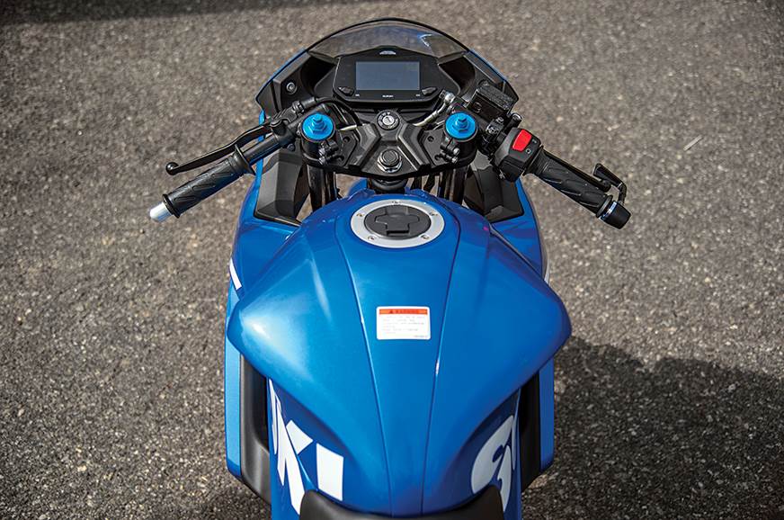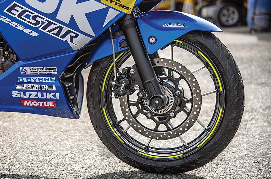 The 249cc engine delivered an engaging performance even when we first rode the stock bike, and what really kept it from being a great machine on the track were the sports-tourer ergonomics. Suzuki has addressed this, and how! The front suspension has its pre-load dialled down, resulting in a lowered fork; a similar adjustment has been made to the rear suspension as well, and both can be adjusted according to the racer’s body weight. A more consequential change comes in the form of the clip-on handlebar that’s now been set 40mm lower. With that, the foot pegs are now set backwards and upwards, both by close to 50mm. Interestingly, the lowered handlebar meant the fairing would get in the way at higher steering angles, and to avoid this, the steering lock has been limited to conform with what Suzuki says are MotoGP-like regulations. This took some getting used to in the pit lane, with a lot of us almost dropping our bikes even before we got out on the track. However, you never notice this on the track, and it just goes to show how little steering input is required to get the bike to lean over. Now, back to how these changes were in application.