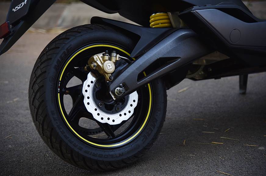 The steel-aluminium hybrid chassis is identical as in the 450's and so are the 12-inch wheels, brakes and suspension units. The only difference is that the telescopic forks have been stiffened for added firmness. Riding the 450 and 450x back to back it was apparent that the x felt lighter and quicker to steer. The scooter was also notably more flickable. That said, the firm set up at the front made it thud over potholes which wasn't the case with the 450 with its relatively plush setup.