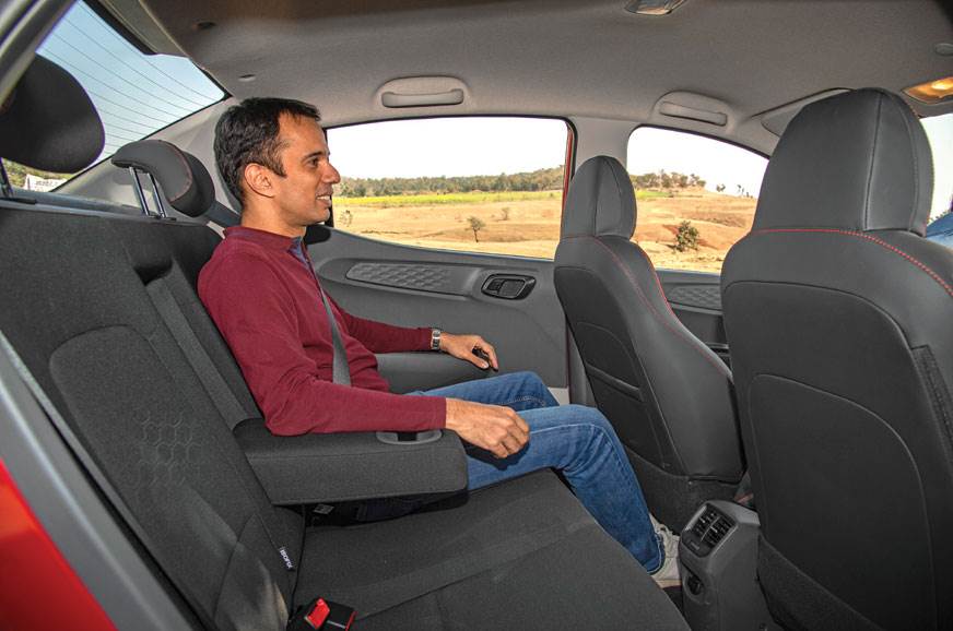 The front seats are wide and supportive, but they don’t get adjustable headrests like the Dzire’s. Moreover, the fixed headrests are small, which is uncomfortable for tall drivers. The seats are comfy as the cushioning is on point. However, as the lumbar support is a little excessive it might cause discomfort while driving for long hours. Seated in the rear, the cabin is just marginally roomier than the Xcent’s. In terms of legroom, the Dzire is clearly more spacious, but the Aura doesn’t feel cramped. The long seat squab also provides good under-thigh support. Headroom is adequate for tall passengers however, passengers taller than 6ft might be left wanting for more room. The backrest is set at a nice and comfortable angle and you do get adjustable headrests for rear passengers. A fixed headrest for the middle passenger, like in the Xcent, is missing. The 402-litre boot is quite spacious, but the loading lip is a little high.