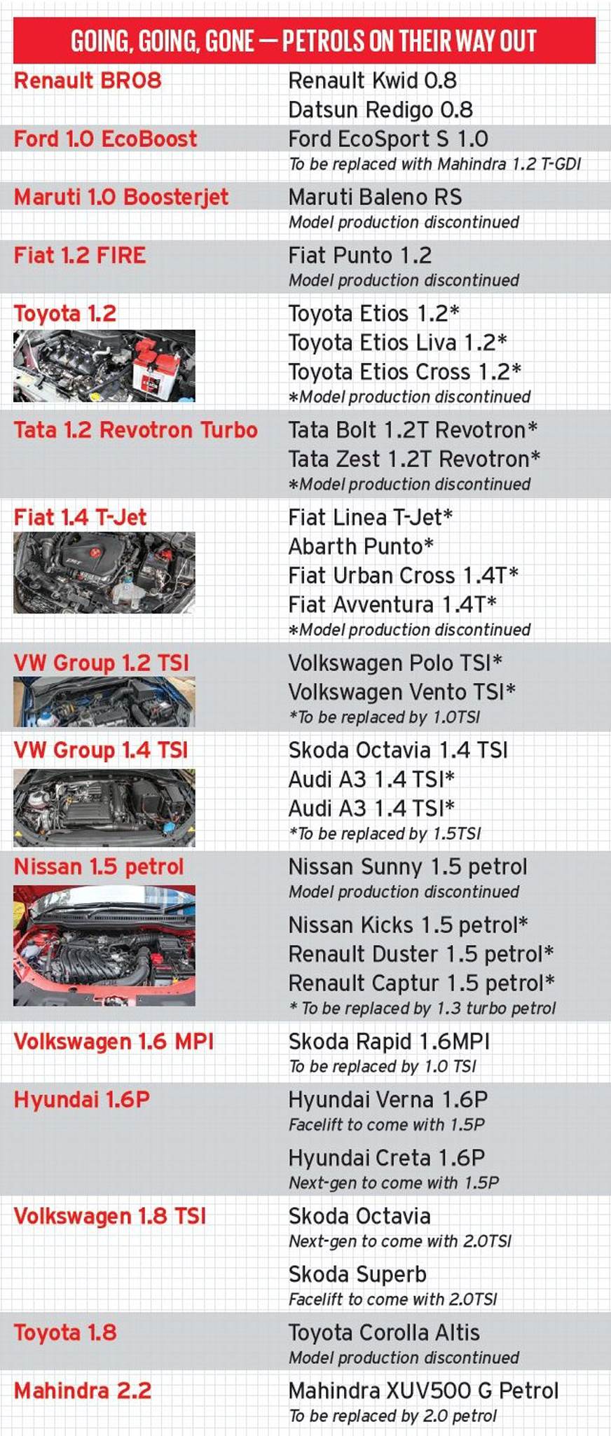Among the bevy of engines that will no longer be available, some of the more notable units include Ford’s powerful Ecoboost engine – it’ll be replaced on the EcoSport in 2021 by Mahindra’s 130hp 1.2-litre mStallion turbo-petrol engine (codenamed G12). Toyota has stopped production of its 1.2-litre petrol unit that powered the Etios Liva hatchback and Etios sedan. Interestingly, Toyota's new smallest petrol engine in India comes from partner Maruti Suzuki, in the form of the 1.2-litre K12B that powers the Glanza.