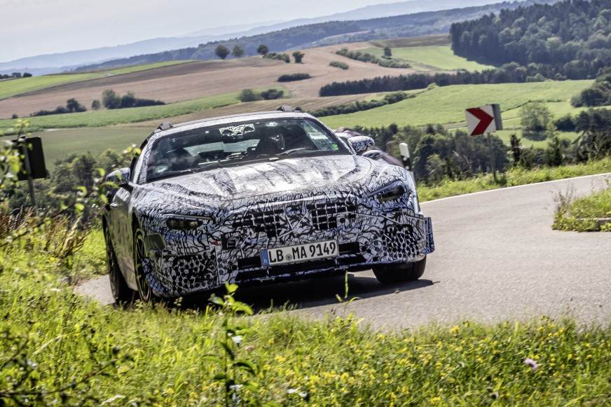 Test mules – despite being largely under wraps – show off a long, sloping bonnet, prominent rear haunches and an angular front grille design. The rounded rear end is similar to that of the Mercedes-AMG GT sports car. The images also confirm previous reports of the new sports car getting a fabric soft-top in place of the fold-out hard-top like its predecessor.