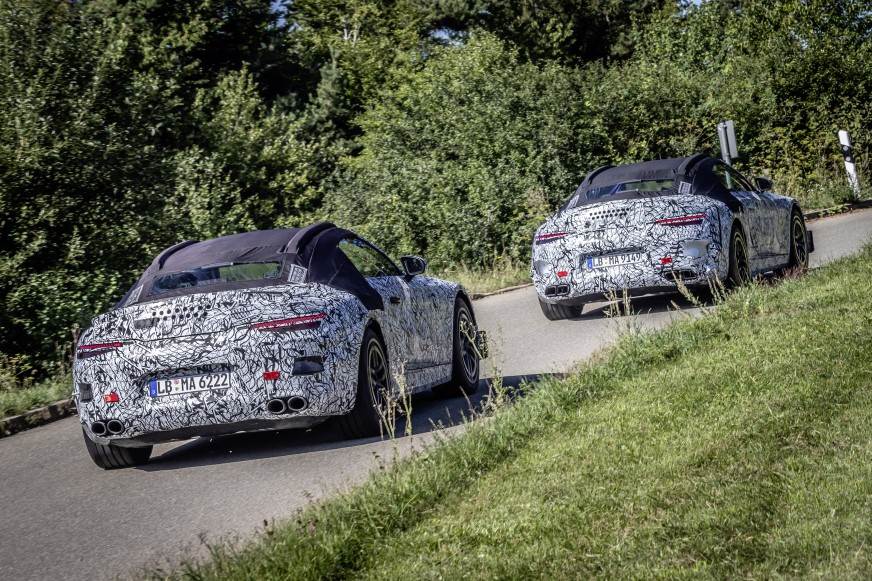 The new Mercedes-Benz SL has been previewed in pre-production form in official images from the German carmaker. The images show a pair of disguised pre-production prototypes of the reborn sports car taking part in on-road testing near the company’s Immendingen technology centre. Both cars show a clear family resemblance to the AMG GT, while the different exhaust tip designs suggest multiple engine derivatives are being put through their paces.