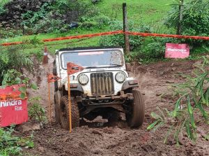 Once on the straight to the finish line, the course was lined with deep alternating ditches that had filled up with water due to the rain. With only one flag, apart from the super flag at the end, remaining, I set off at crawl speeds in first gear. Most competitors made the mistake of using flat out power to clear this obstacle, leading to a loss of points under the vehicle preservation section (you got marked on how well you preserved your vehicle during the obstacle). With a touch of finesse, the Thar easily cleared the water-filled ditches. The end of the stage required getting out of one big ditch and collecting a super flag on the right.
