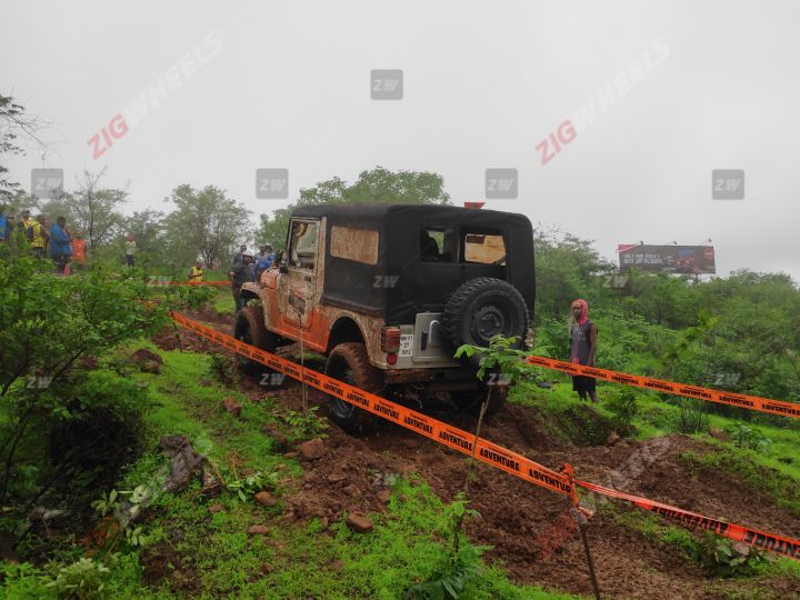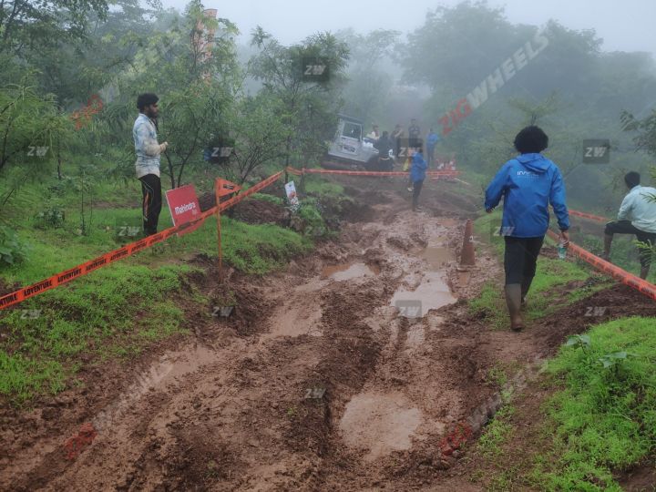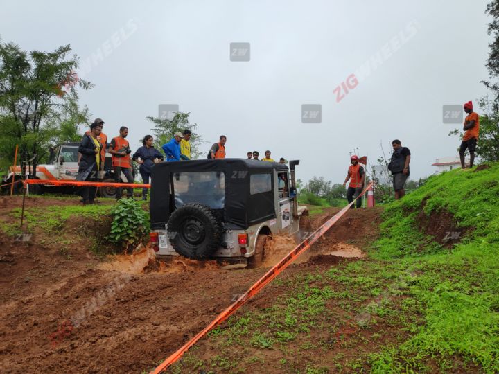 The surface of the incline was muddy and acted like grease. It didn't have enough water to make it slushy, but at the same time the mud looked slick. Chances of finding any kind of traction were slim. As I went for my first attempt, I put the Thar in second gear (4-Low was previously engaged) and floored the throttle hoping that good old-fashioned power would help me clear the obstacle. Boy, was I wrong. The Thar went up the incline and within a couple of meters was just spinning its tyres wildly, making no upward progress and I was still some considerable distance away from the first flag. In the second attempt, I backed up the Thar to the farthest point to gain some extra momentum, stretching the bunting to its limit (breaking it would result in me incurring a DNF), floored it and immediately dumped the clutch. I managed to make progress but my hand was still not able to reach the first flag.