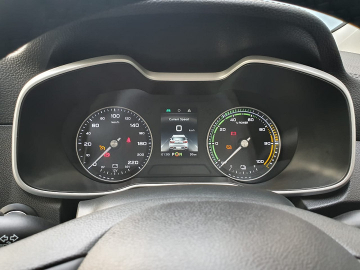 The instrument cluster features two analogue dials and a digital MID. The dials show the speed and the percentage of power used while the MID displays various things like...